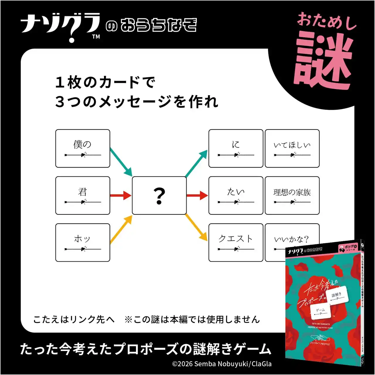 札幌市にあるボードゲーム・謎解きゲームのメーカー・出版社であるClaGla(クラグラ)は、謎解きゲーム『たった今考えたプロポーズの謎解きゲーム』を2026年5月23日(土)に発売いたします。 |