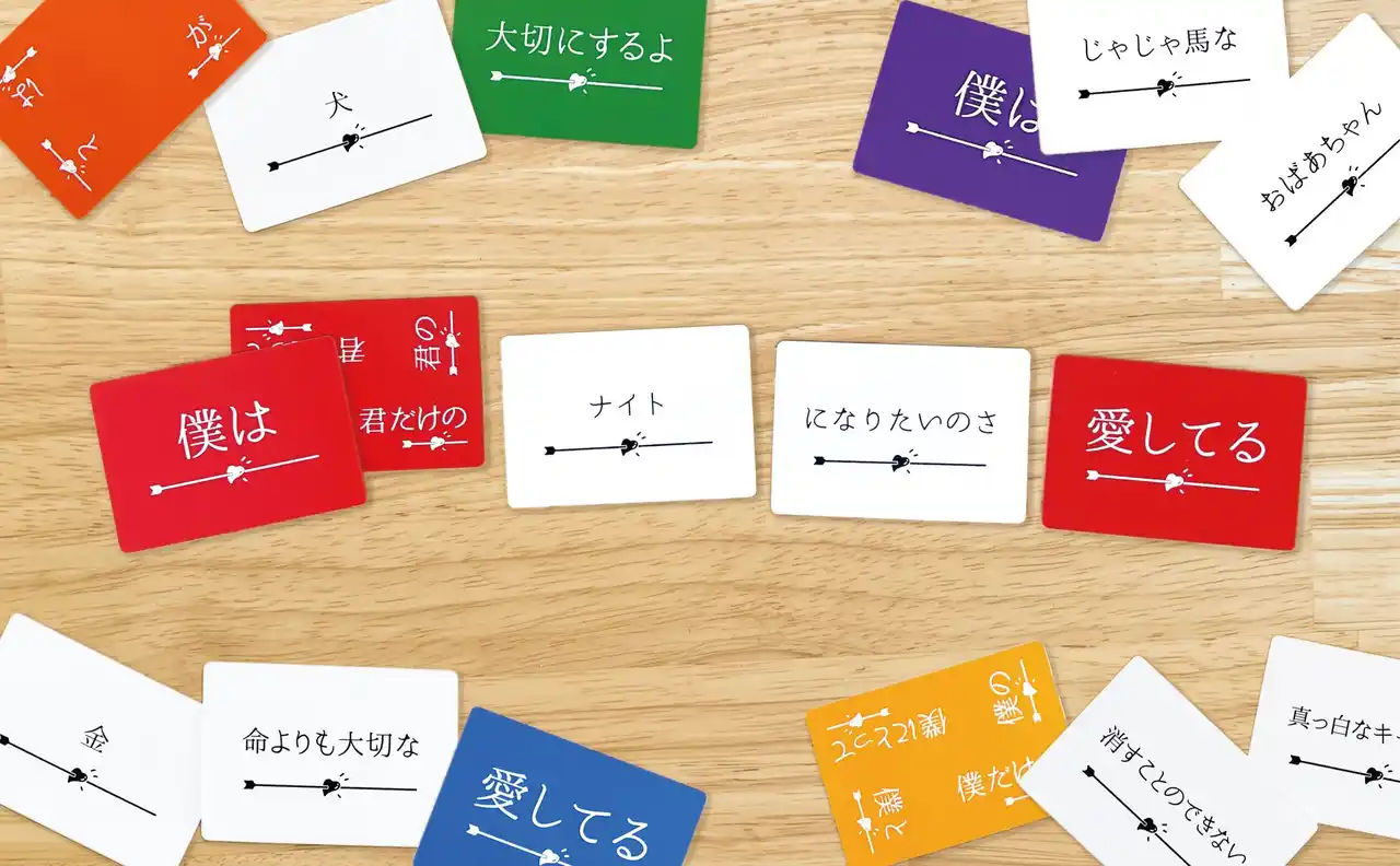 ルールはとっても簡単。親プレイヤーがゆっくり10数える間に、配られた手札を自由に組み合わせて、プロポーズの言葉を作り、親プレイヤーに愛の告白をしましょう! ときには真面目に、ときには笑いで、プロポーズをする人もされる人も、ちょっぴり恥ずかしくて、とっても嬉しくなってしまう、幸せいっぱいのパーティーゲームです。 |