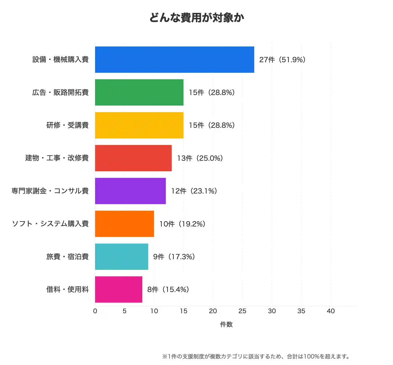 | 機器の購入や施設整備にかかる設備・機械購入費が中心で、研修・受講費や広告・販路開拓費も同程度の件数で並んでいます。 | ||||||||||||||