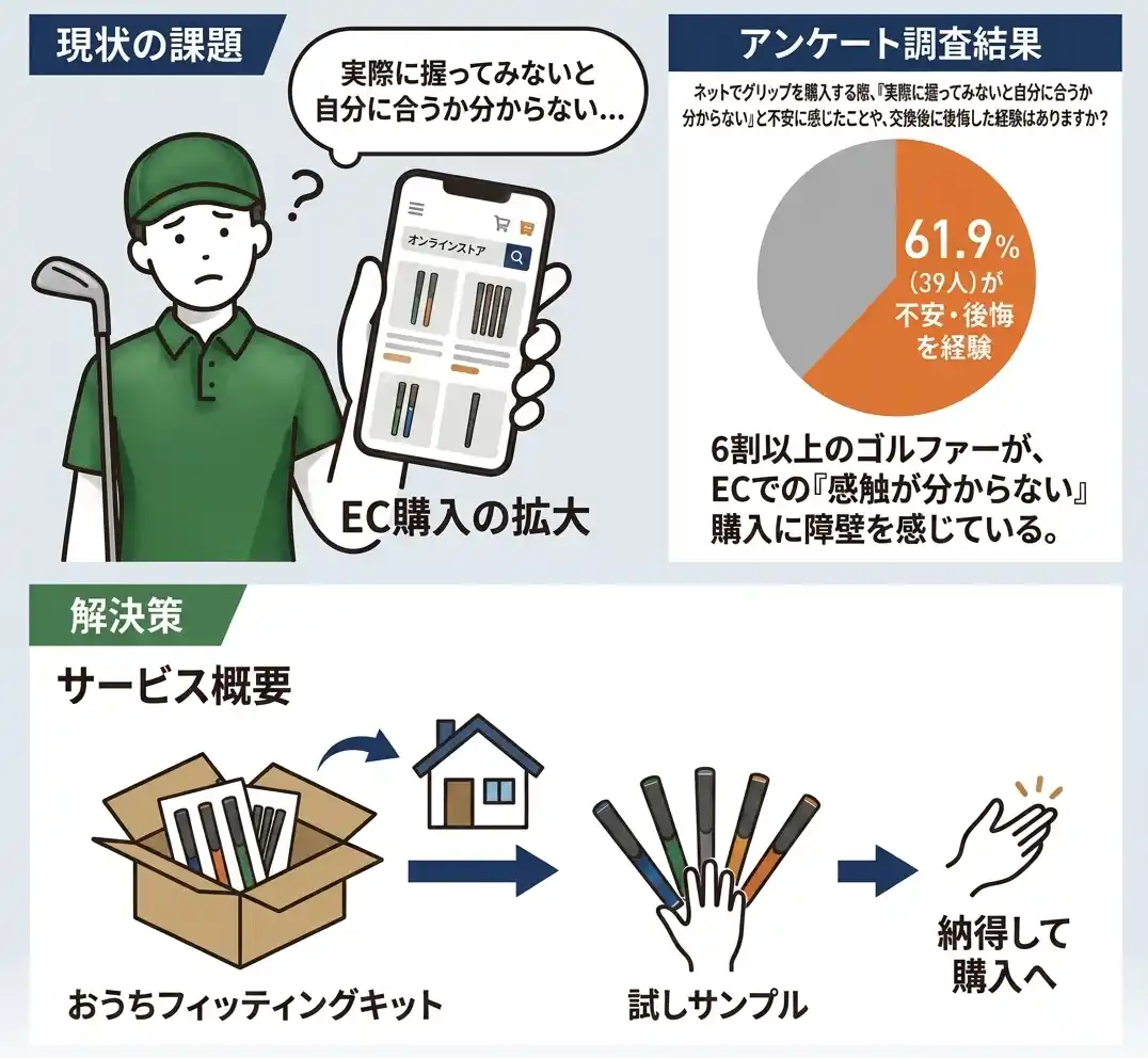| 一方で、グリップのように「感触」が重要な製品においては、実際に試せないことが購入の障壁となっています。 | |||||||||||||||||||||