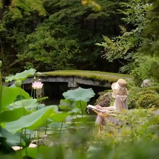 白沙村荘の庭園で写生を行う定家亜由子 |