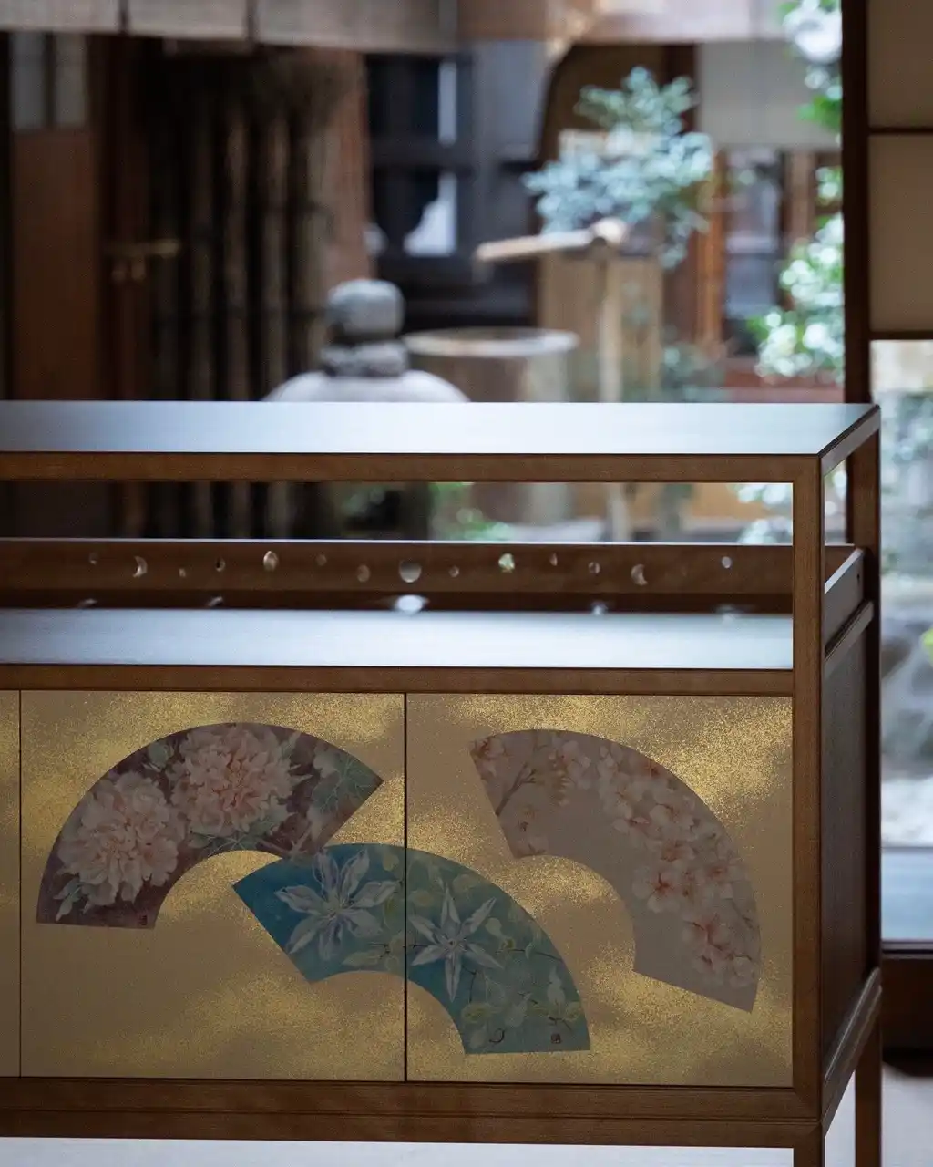 本展の見どころのひとつは、京指物の伝統を守る老舗家具・宮崎家具との協働による四季飾り棚「祥雲の花」の展示です。1856年創業の宮崎家具が掲げる「再興」の精神のもと、京指物の系譜と日本画の伝統技法を現代において結び直すことを目指して制作されました。桜材を用いた飾り棚に、日本画による花の扉絵、夜光貝による螺鈿、青金と黄金の純金砂子による雲の表現など、絵画・工芸・家具の領域を横断する一作です。吉兆の象徴である雲にちなみ、「祥雲の花」と名付けられました。 |