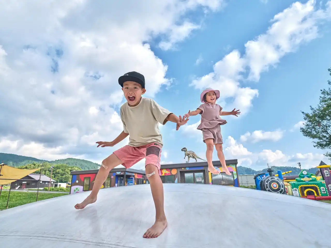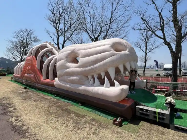 全長約20mの恐竜化石をモチーフにした巨大遊具「スケルトンダイナソー」を中心に、大型トランポリンやふわふわ遊具など、小さなお子さまでも安心して身体を動かせるコンテンツを揃えています。さらに、ストライダーエリアやアスレチック、水遊びエリアなども備え、遊びの幅が広がります。 |