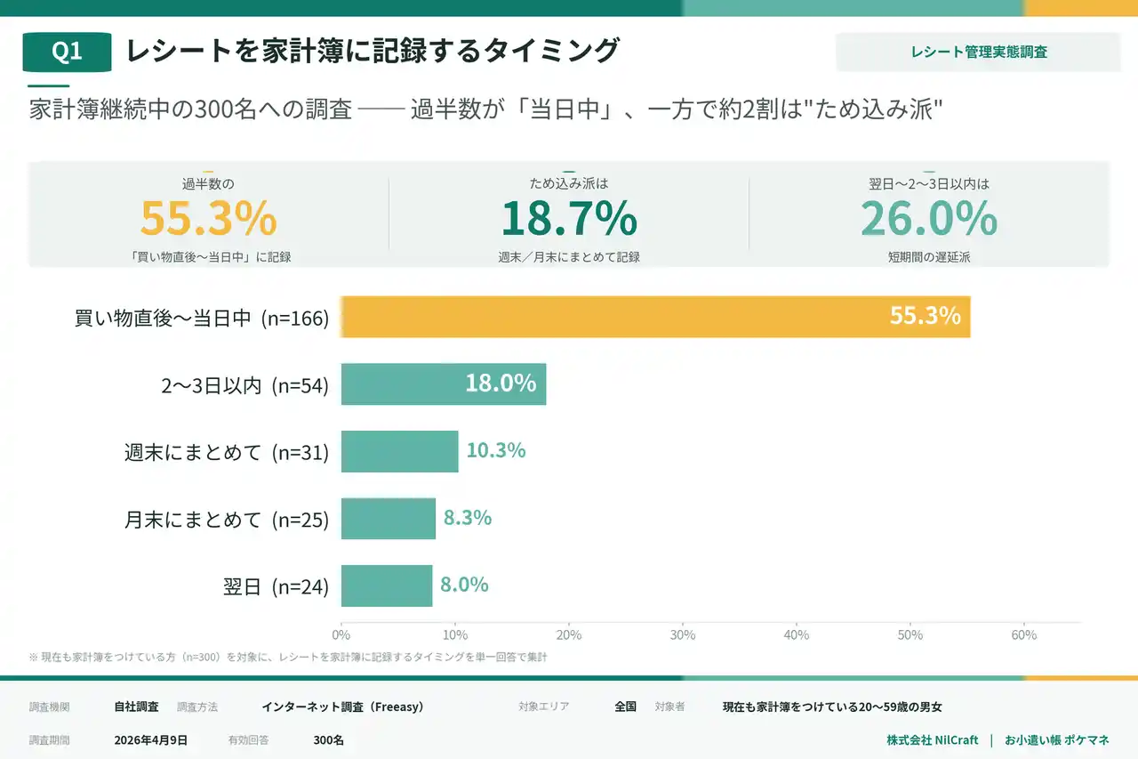 レシートを家計簿に記録するタイミング──55.3%が「買い物直後~当日中」と回答 |