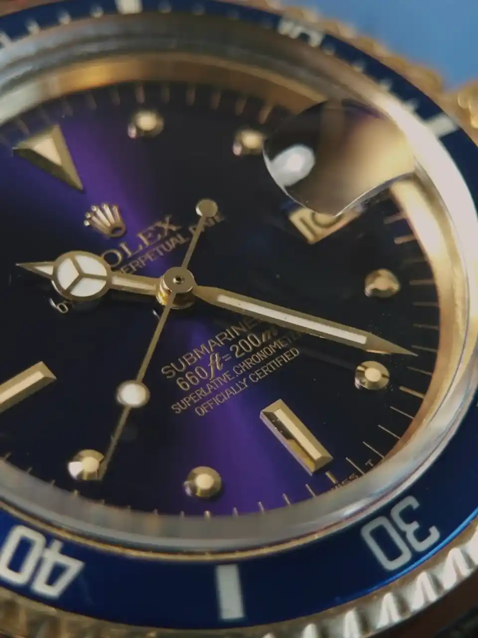 | ROLEX 18k YG “PUPLE CHANGE” Nipple Blue Submariner Date 1973s | ||||||||||||||