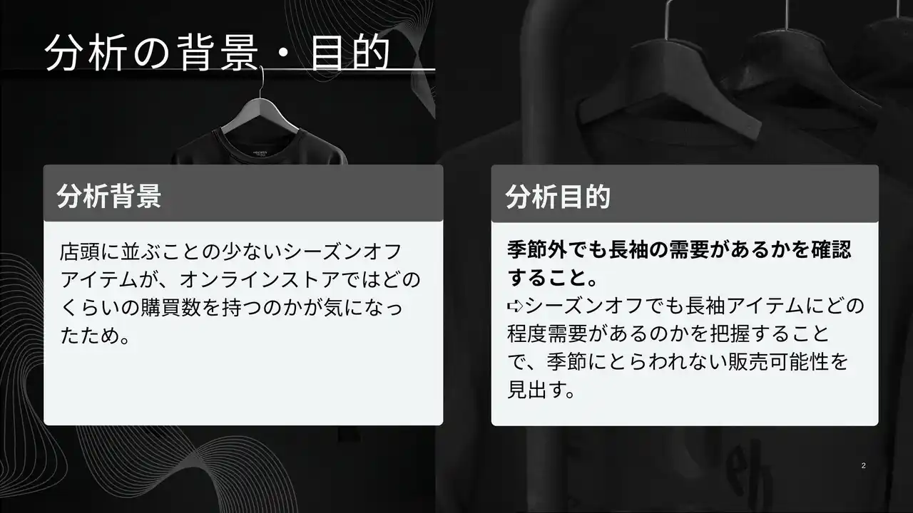 「温暖化の影響で夏は暑さを増し、人々の室内で過ごす時間が増えたからこそ、冷房対策のための長袖が必要とされているのではないか?」という仮説はとても筋道が立っているもので、かつ気候変動を受けて商品構成に苦戦しているアパレル業界にとってとても意義のあるテーマだと思います。 |
