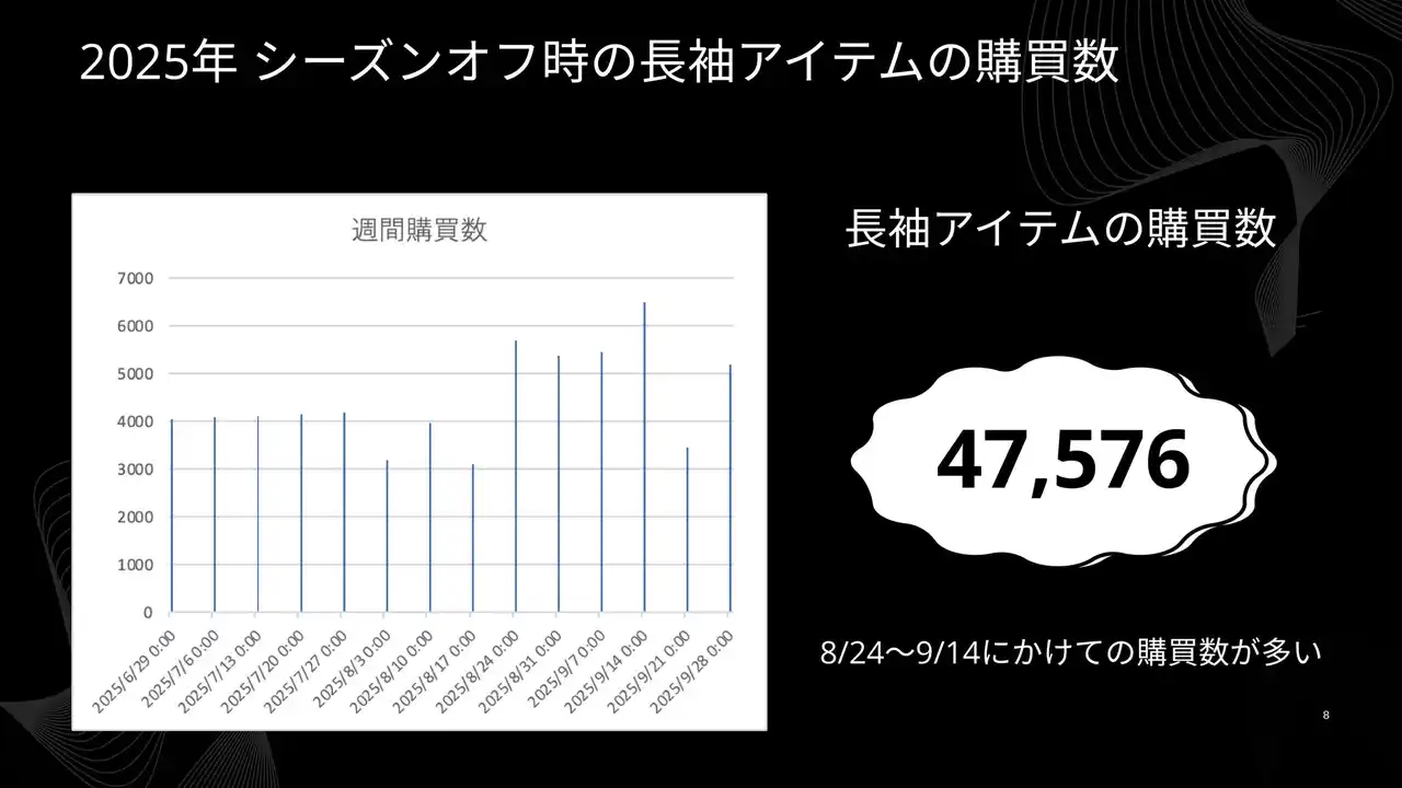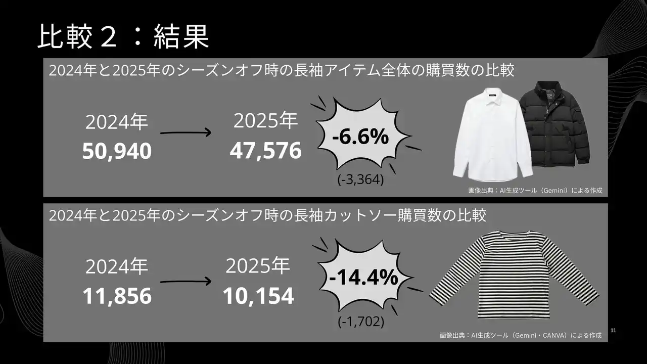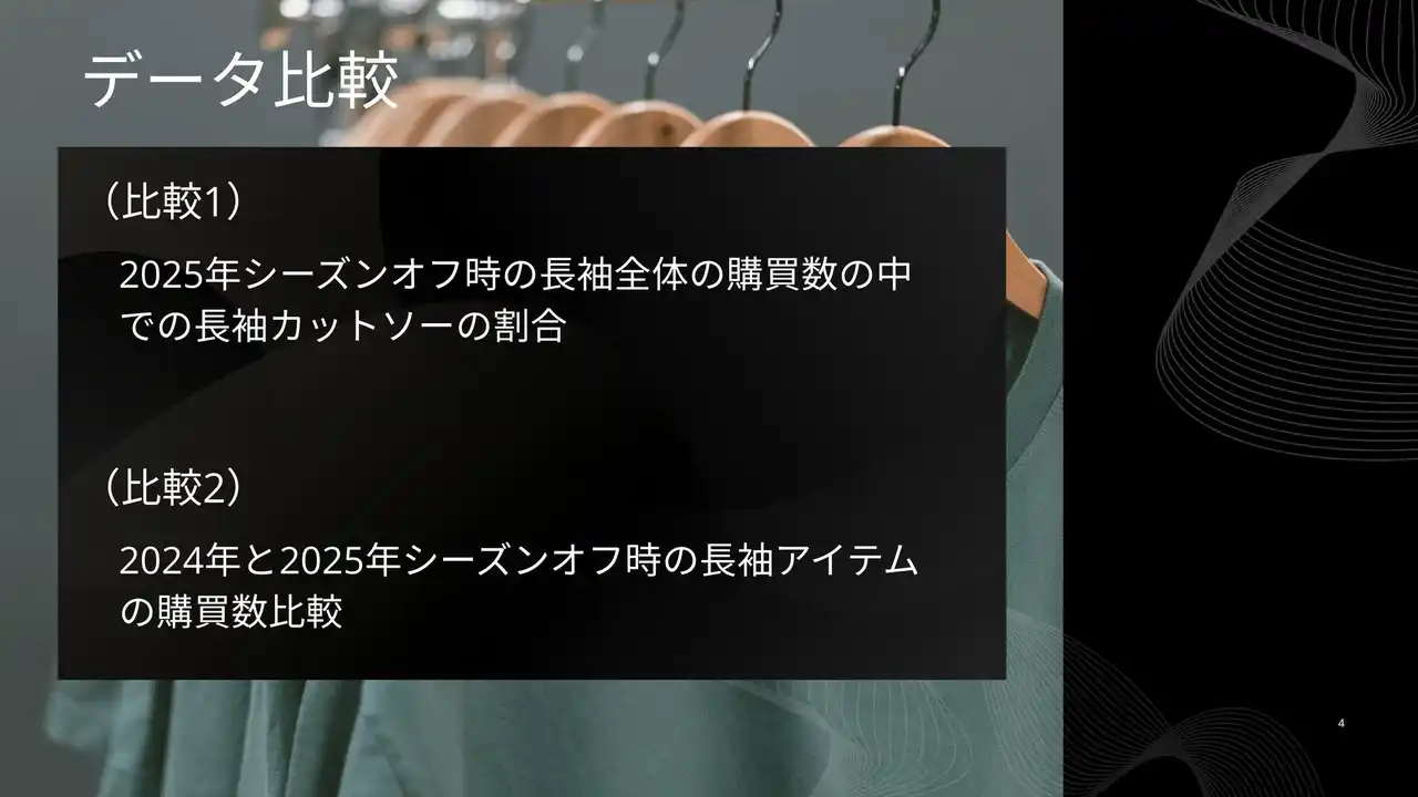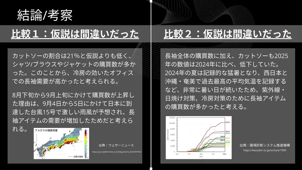 「2025年は2024年より長袖カットソーのニーズが高まっているのではないか?」という仮説自体は立証されたなかったものの、そもそも2024年、2025年ともにカットソー全体の20%程度が長袖だったという調査結果には十分示唆に富むものです。 |