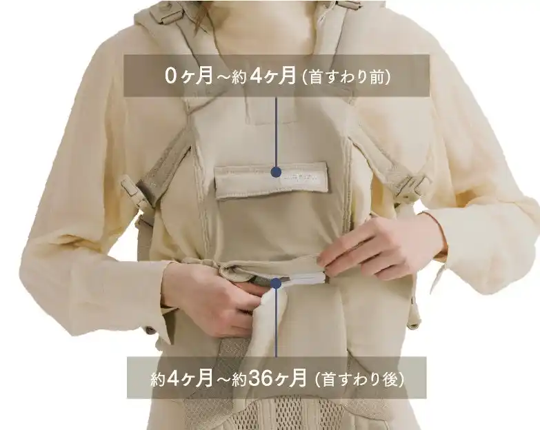 | ファスナーを付け替えるだけでお尻の位置(座面の高さ)を2段階に変更可能。赤ちゃんの成長に合わせて常に最適なポジションに調整できます。 | |||||||||
