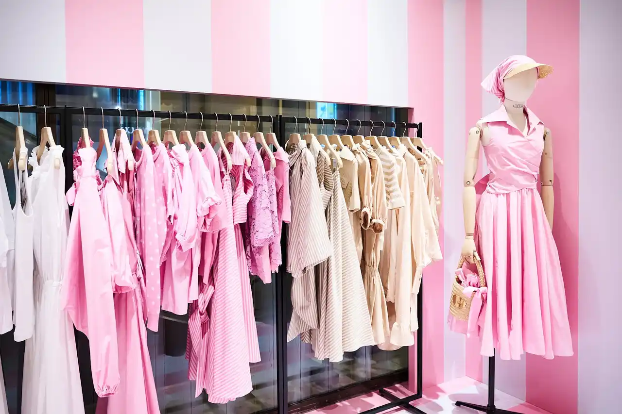 店頭はブランドカラーのピンクと、今シーズンのムードを映したストライプをあしらった壁を背景に、カフェを思わせるテーブルやチェアが並ぶほか、クッキーショップをイメージしたブースも登場。南フランスの海辺のリゾートを思わせる、華やかな空間に仕上がっています。 |