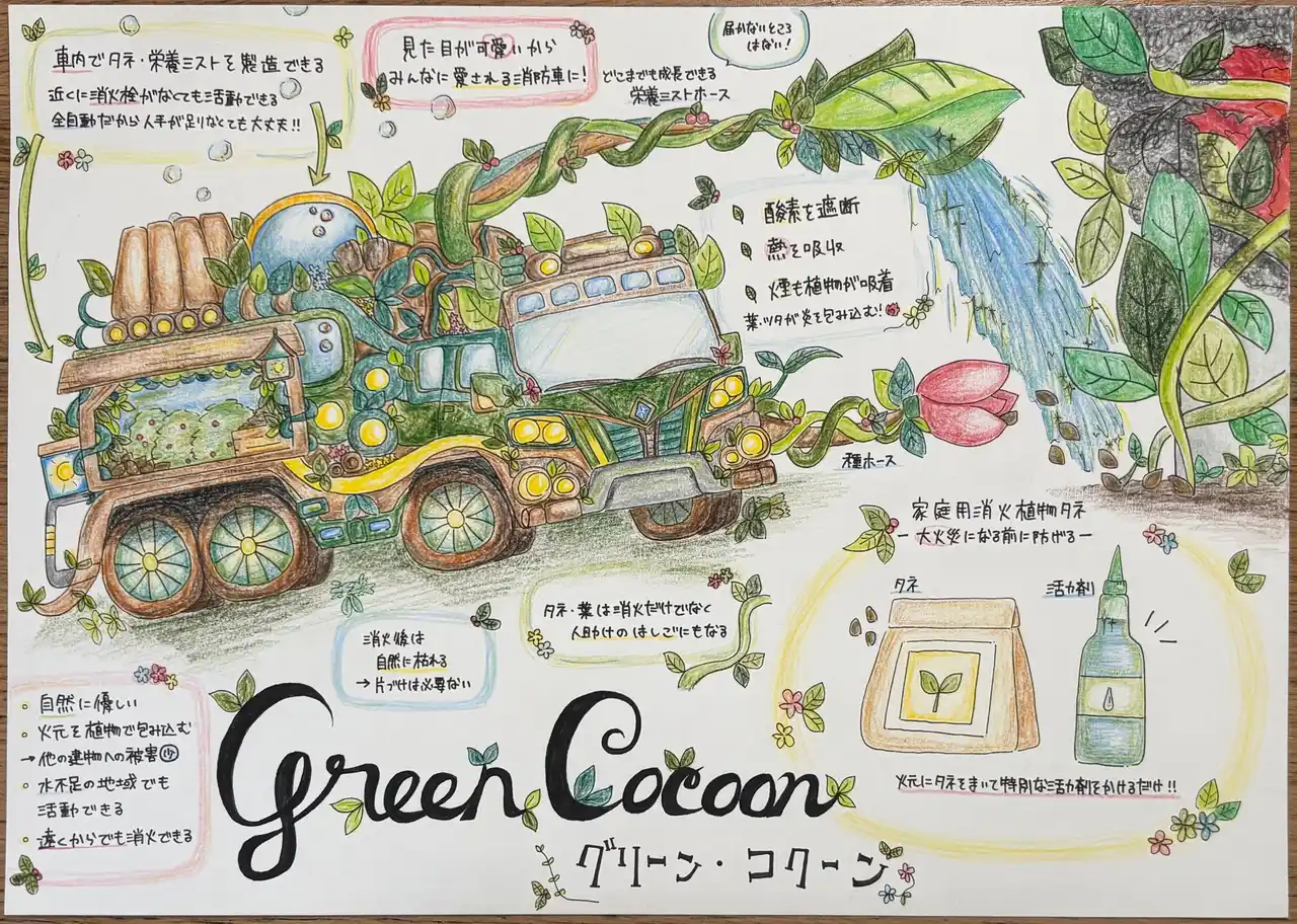 私が考えたこの消防車は、「火を消す」のではなく、「植物の力で火を包み込んで鎮める」消防車です。名前(グリーン・コクーン)の由来は繭のように包み込むことから来ました。 この消防車は、水を使うのではなく特殊なタネと栄養ミストをまき、数秒で成長したツタや巨大な葉が火元を優しく包み込みます。植物が酸素を遮り、熱や煙を吸収することで、環境にやさしく安全に消火できます。 また、車体そのものが動く農園のようになっていて、車内で植物を育てることもできます。