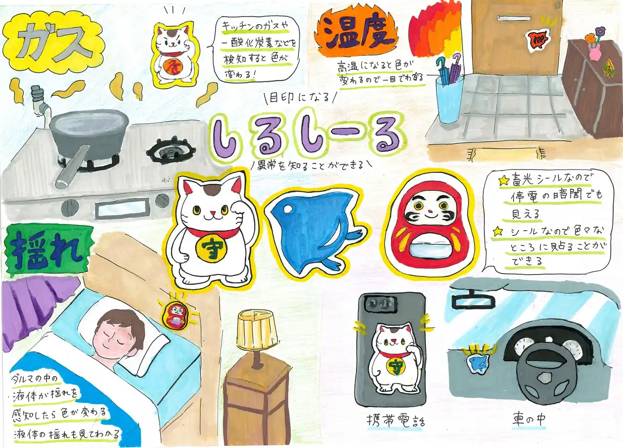 手軽に誰でも防災ができるアイテムを考えました。シールにすることで安価で持ち運びやすく設置する場所にも困らないところがポイントです。目で見て知ることができるでので耳が不自由な人もそうでない人も異常を一目でわかります。ガス漏れなどは目に見えないので特にあったら良いなと思い考えました。見た目を和風の縁起のいいモチーフにしてお守りの意味も込めました。 |