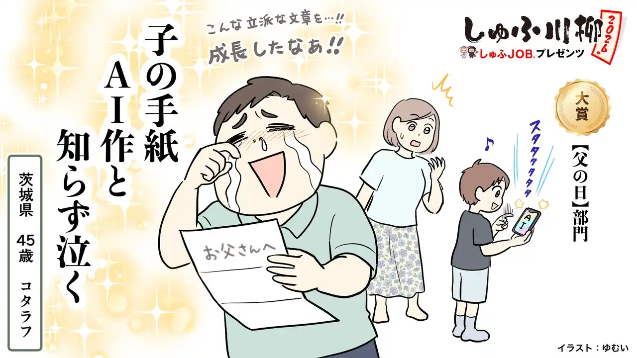 ■川柳投稿エピソード:本当によくできています。 <審査員コメント ※敬称略> 川上:お父さんの様子を想像して、微笑ましさとその後の落差に思わず吹き出しました。「AIが作ったんかい!」とツッコみたくなりますが、それでも子どもからもらう手紙は無条件に嬉しいものですよね。 修士:読書感想文もAIが作る時代、親への手紙もAIでしょうそりゃあ。もう結婚式の父親の手紙もそうなるじゃないですか。 小堀:本当にある話だと思います。僕は泣いてしまうと思いますけど! |