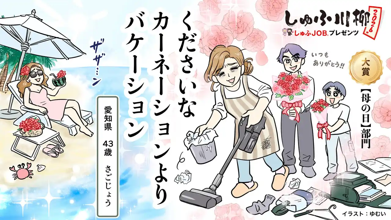「しゅふJOBプレゼンツ しゅふ川柳」は、主婦・主夫の皆さまが日々の暮らしの中で感じた思いや気づきを、川柳として共有する企画です。家事や仕事、子育てに向き合う日常の中で生まれる笑いや戸惑いが、五・七・五の言葉にのせて表現されています。第4回となる今回は募集部門を刷新し、より多様なテーマで作品を募集しました。 |