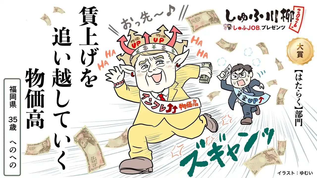 ■川柳投稿エピソード:給料が少し上がってもすごい勢いで値上げ値上げ <審査員コメント ※敬称略> 上重:日に日に家計を圧迫する物価高。世間の声が代弁されていますね。 川上:賃上げ○%と言われて一瞬は喜んでも、それ以上に物価が上がっていくスピードが速すぎて、悲しみが喜びを追い越してしまう。同じ無念さを感じている人は、少なくないのではないでしょうか。 修士:賃上げは嬉しい事やのに、物価高のせいでなんにもならない事をさらっと詠ってる感じがして、どうにもならない社会や政治を皮肉ってる感じが好みです! |