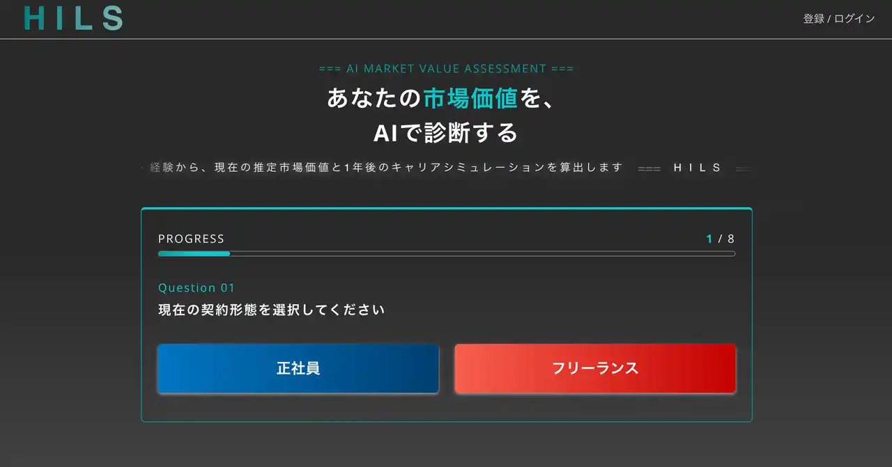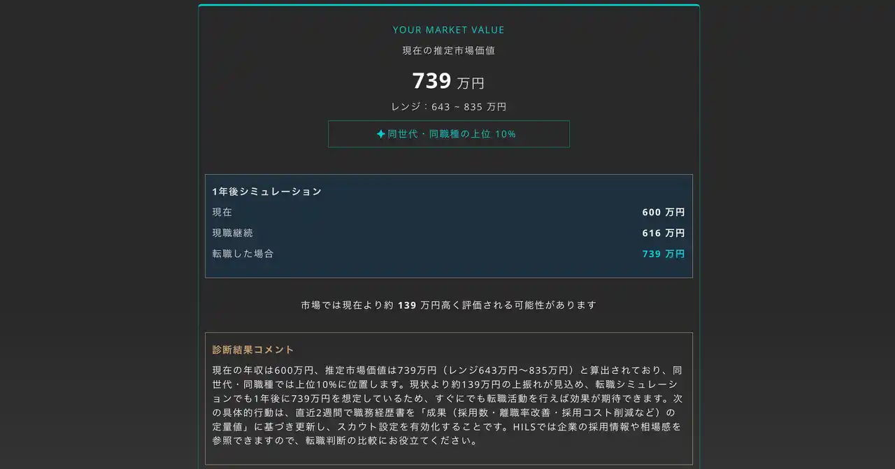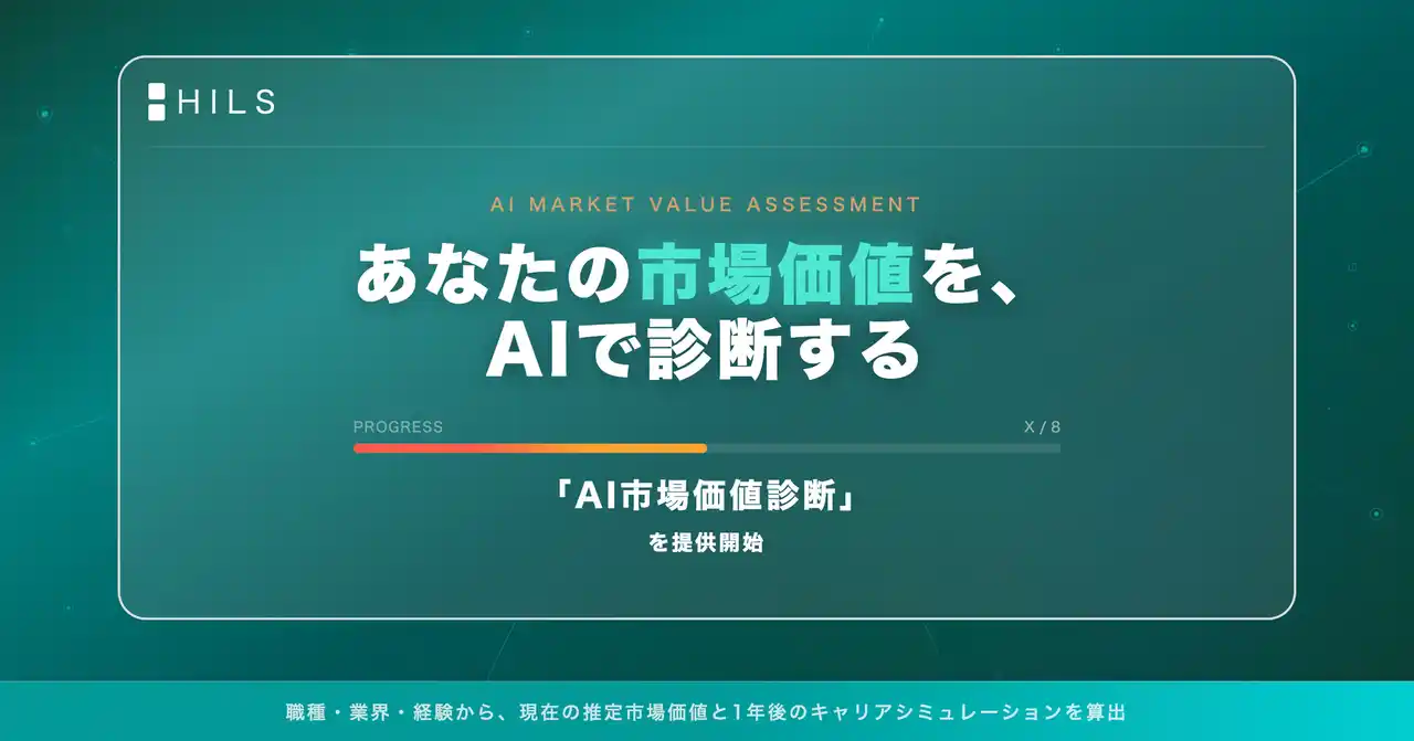 キャリア系マッチングプラットフォーム「HILS」を運営するHilgard株式会社(本社:東京都中央区、代表取締役:大森隆太郎)は、AI市場価値診断機能を2026年4月より提供開始しました。業種・職種・経験年数などわずか8項目に回答するだけで、AIが現在の推定市場価値(年収レンジ)、同世代・同職種内でのポジション、1年後のキャリアシミュレーション、そしてパーソナライズされた診断結果コメントを即時に算出・表示します。 |
