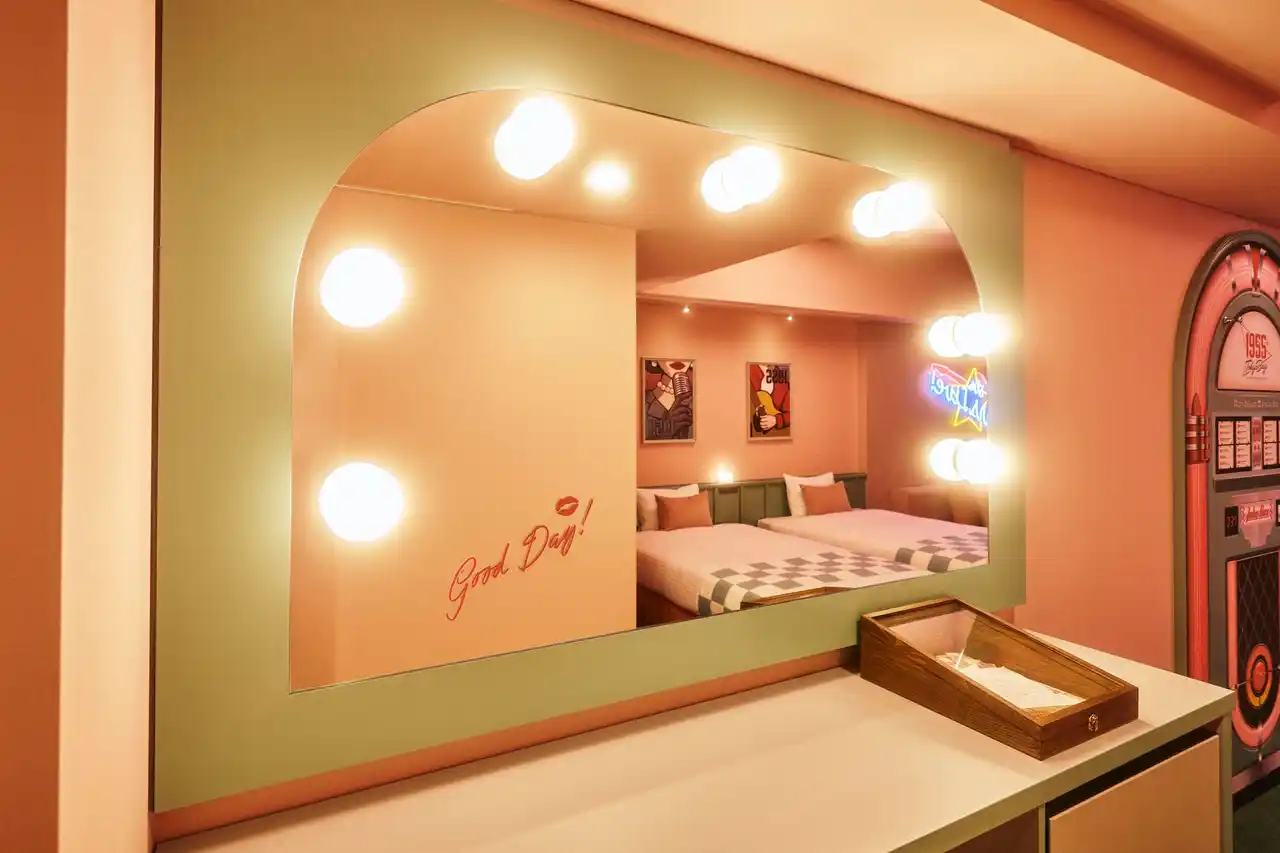 | ~楽屋とオンステージ、2つのエリアで構成された新客室。50年代アメリカのスターになりきって、当時の世界観に没入する体験を提供~ |
