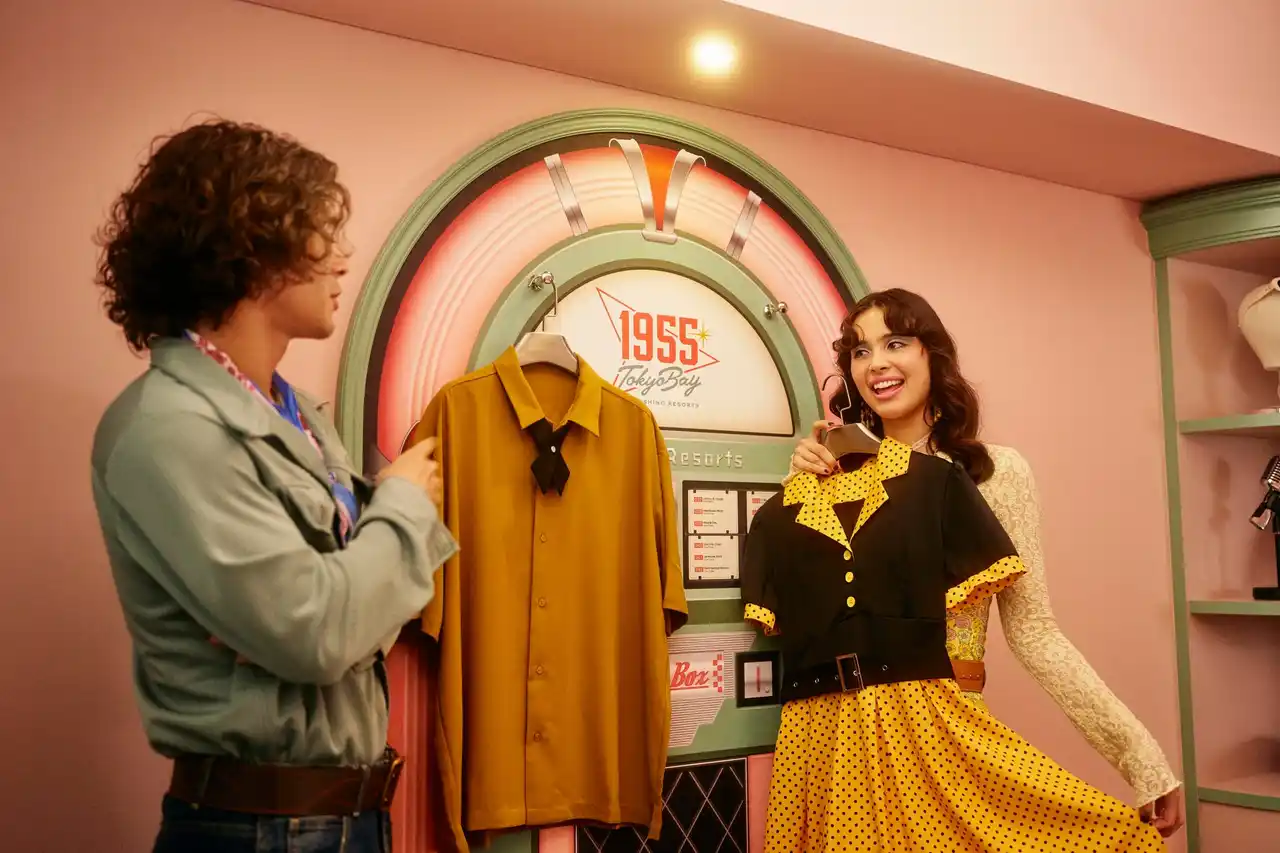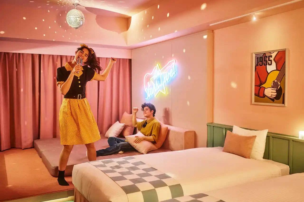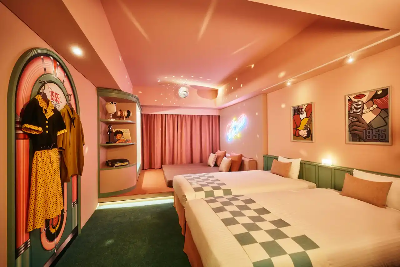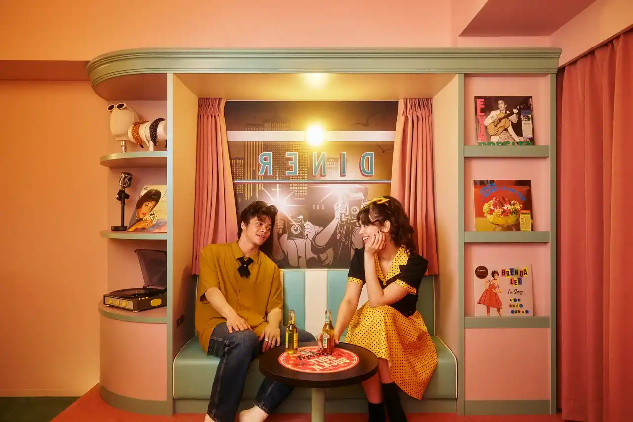 | 便利で快適なテーマパーク旅を追求する、1955年のアメリカがモチーフのホテル「1955 東京ベイ by 星野リゾート」は、2026年4月22日から、50年代のアメリカのスターになりきってすごせる、2室限定の新しいコンセプトルーム「50sスターダムルーム」の予約受付を開始します。客室の入口側には、ハリウッドミラーが目を引くドレッサーや、ステージ衣装がかかったジュークボックスデザインのウォールハンガーがあり、スターの楽屋をモチーフにしたエリアになっています。そして客室奥側のエリアは、ミラーボールが回り、ネオンサインが輝くオンステージがモチーフです。実際に衣装を着てマイクを握れば、50年代のスターになりきって過ごせます。 | |||||||