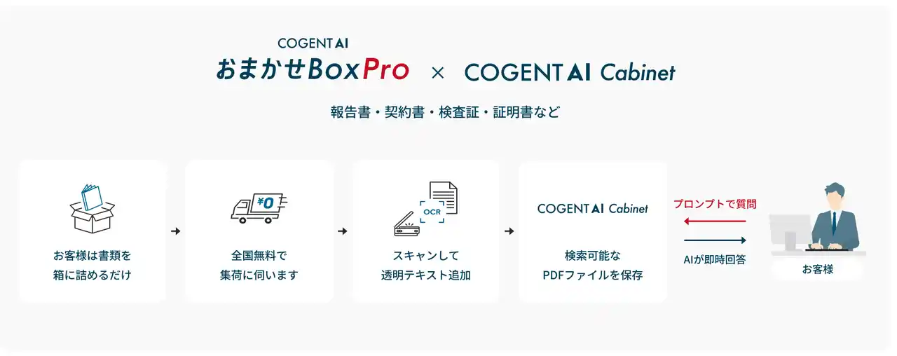 書類を箱に詰めるだけで電子化され、PDFでCabinetに保存。必要な情報を、プロンプトですぐに引き出すことができます。 |