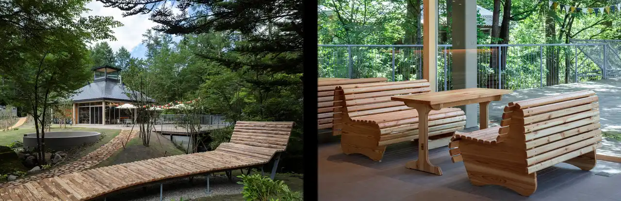 この「蓼科カラマツ」の世界観を体感できる拠点が『東急リゾートタウン蓼科』の中心部に位置するインフォメーションセンター「TENOHA蓼科」です。この施設内の家具や壁材にはタウンの敷地内で採れた「蓼科カラマツ」の間伐材を100%使用しており、施設全体が「地域で育ち、地域で活かす」完全な資源の地域循環モデルを体現する空間となっています。来訪者は、カラマツの温もりや美しさを五感で味わうと同時に、蓼科の森のストーリーや環境保全への取り組みを自然な形で体感できます。 |