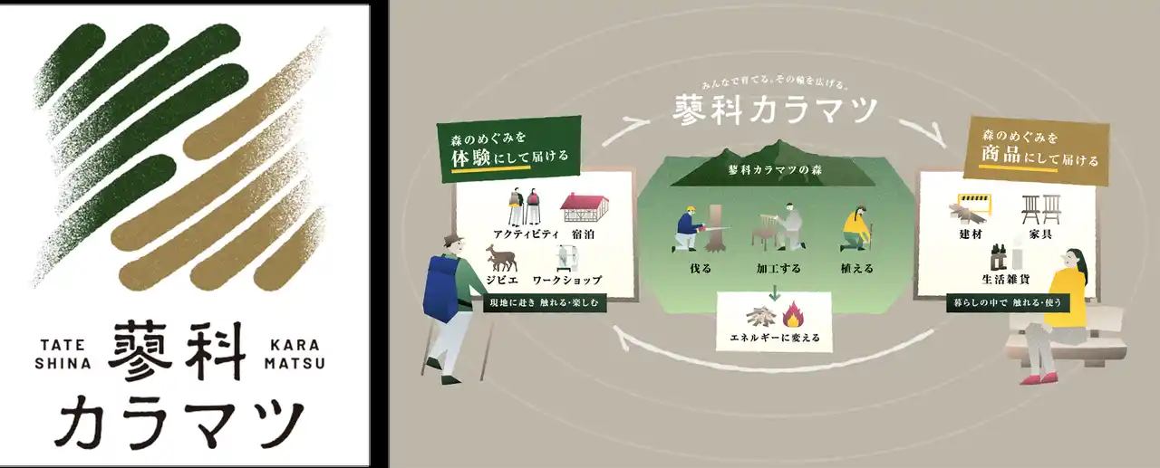 本プロジェクトは、地域の仲間と共にカラマツの可能性を最大限に引き出すプロジェクトであり、そのサイクルから生まれるすべてのプロダクトや体験の総称です。森の恵みを暮らしへ届け、暮らしの中で生まれた喜びや経済が、再び森を育む力へと還っていき、生活者も事業者も立場を越えて、この新しい循環の担い手となることを目指します。 |