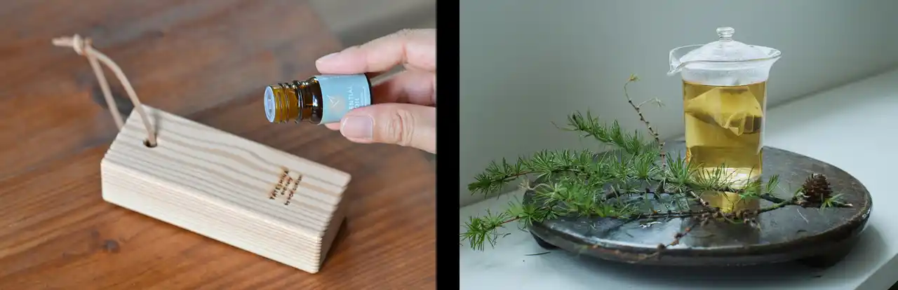 蓼科のカラマツを使用したプロダクト(左:枝を使ったアロマ、右:葉を使ったお茶) |