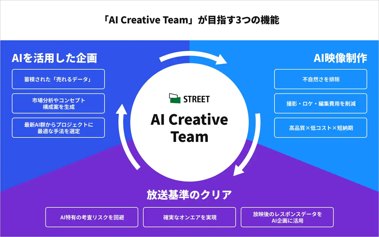 そこでストリートは、独自のAIワークフローを構築し、企画から検証までを一気通貫でマネジメントする生成AI専門組織「AI Creative Team」を発足しました。本組織では、低コストで複数パターンの同時制作を可能にすることで、テレビ通販CM領域における「長尺の運用型CM(獲得型CM)」の実装を支援します。 |