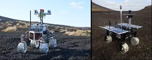 左写真:探査ロボット(ローバ)・右写真:火星表層模擬物質(シミュラント) |