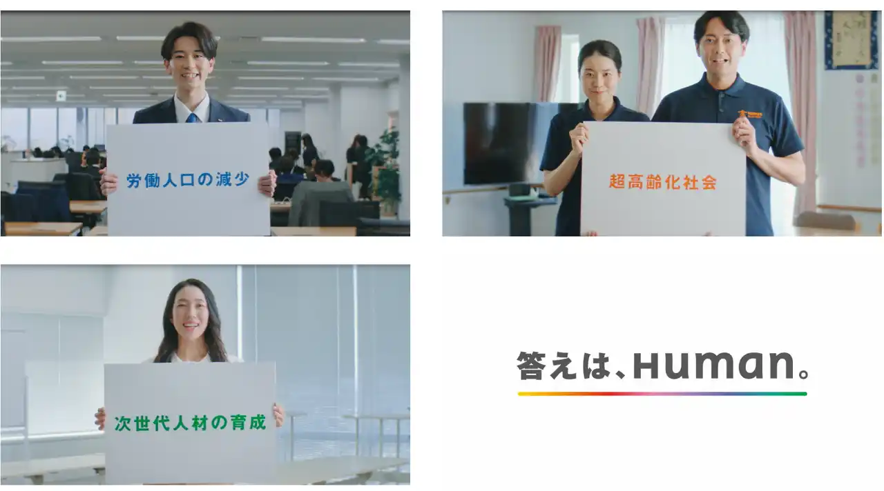 昨年2025年に展開したTVCM「答えは、Human~歌のリレー」篇では、その歩みに加え、“人の可能性”を広く届けるため、「答えは、Human。」というメッセージを軸に、当社グループが展開する各事業を歌でつなぐリレー形式で表現。当社のバリュープロミス「SELFing(セルフィング/一人ひとりの「なりたい自分」の実現)」を反映し、奇妙礼太郎氏の歌声とともに“人間そのもの”を応援するメッセージを発信いたしました。 |