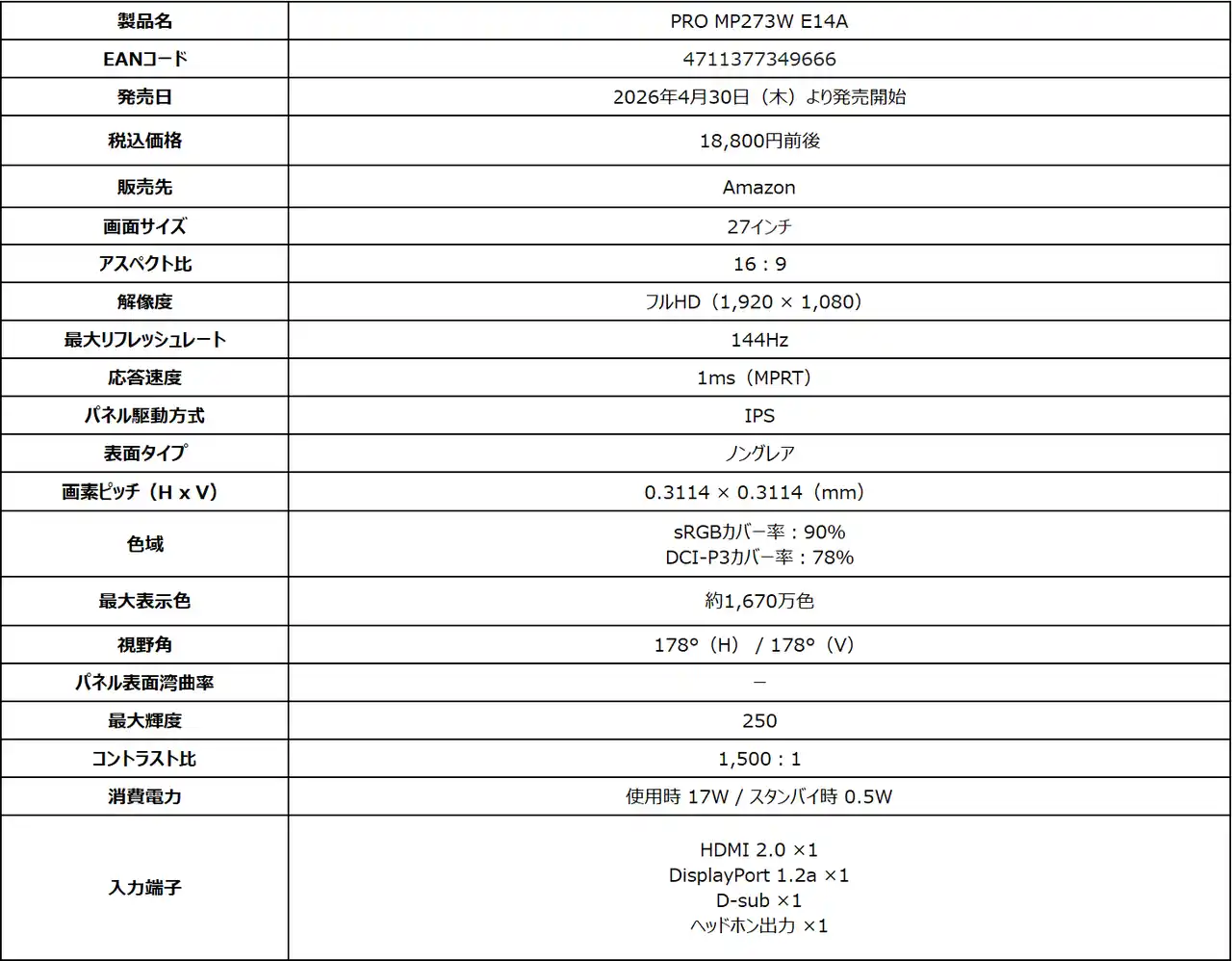 この度、エムエスアイコンピュータージャパン株式会社は2026年4月30日(木)より、ビジネス向けモニターの新モデルを発売いたします。大きな画面で見やすい27インチ、リフレッシュレート144Hz表示に対応した高画質IPSパネル、スピーカー、対応したPCとの電源連動など多彩な機能を備え、効率的なワークスペース構築を支援するビジネスモニター「PRO MP273W E14A」が新たにラインナップに加わります。 |