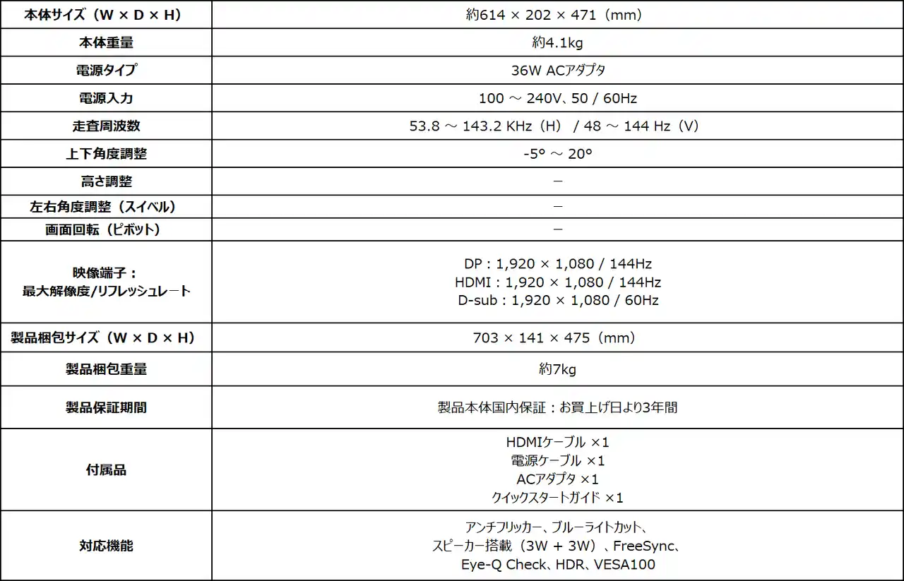 ・一般的な60Hzのモニターと比べ2倍以上となるリフレッシュレート144Hzの滑からな映像表示で、目の疲労を軽減 |