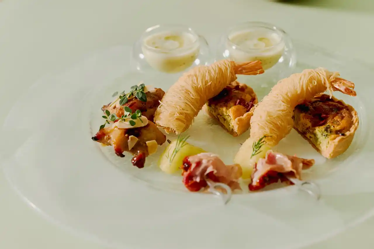 ぷりっとした大ぶりの海老に、トルコの伝統的な細麺状の衣「カダイフ」を丁寧に巻き付けて香ばしく揚げました。 |