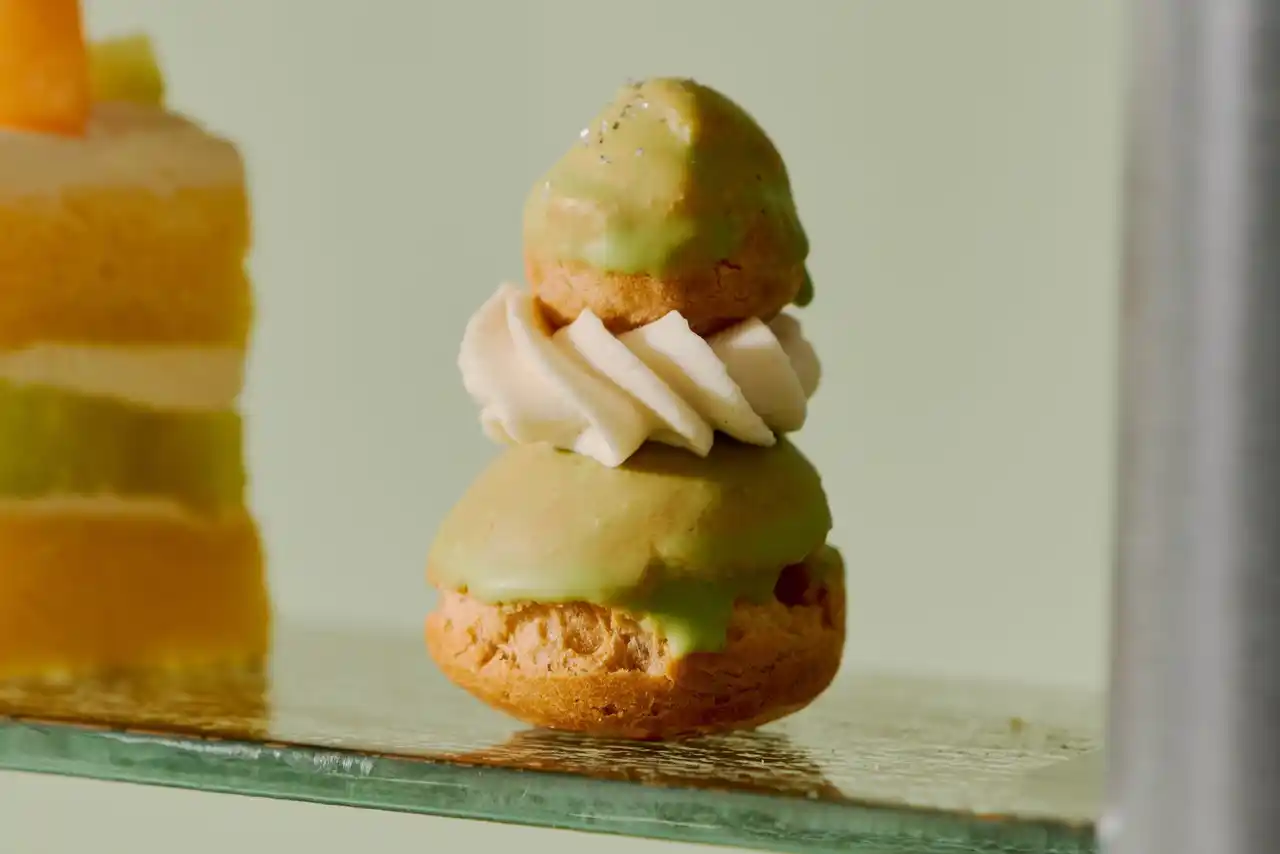 フランスの伝統菓子「ルリジューズ」をメロン仕立てに。大小重ねた可愛らしいシュー生地の中には、滑らかなメロンカスタードを詰め込みました。 |