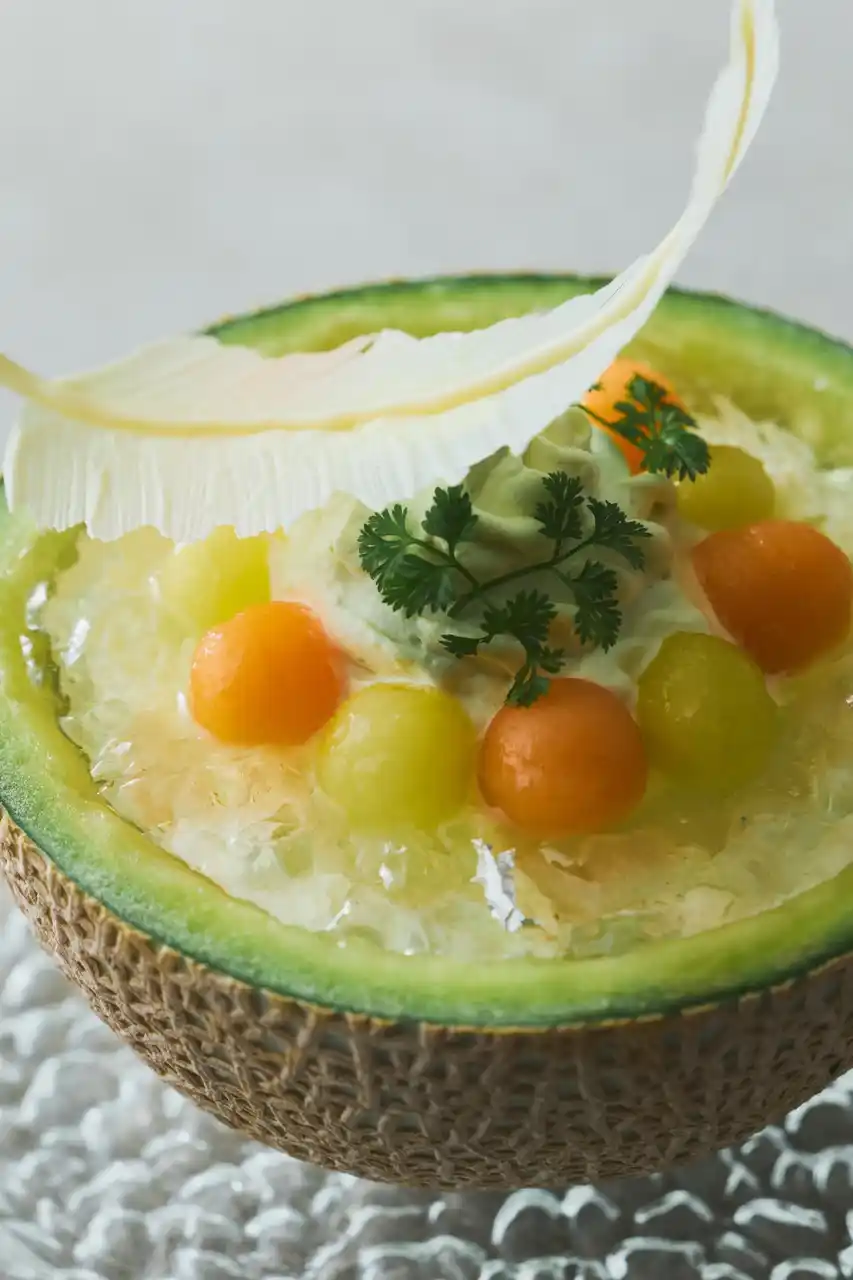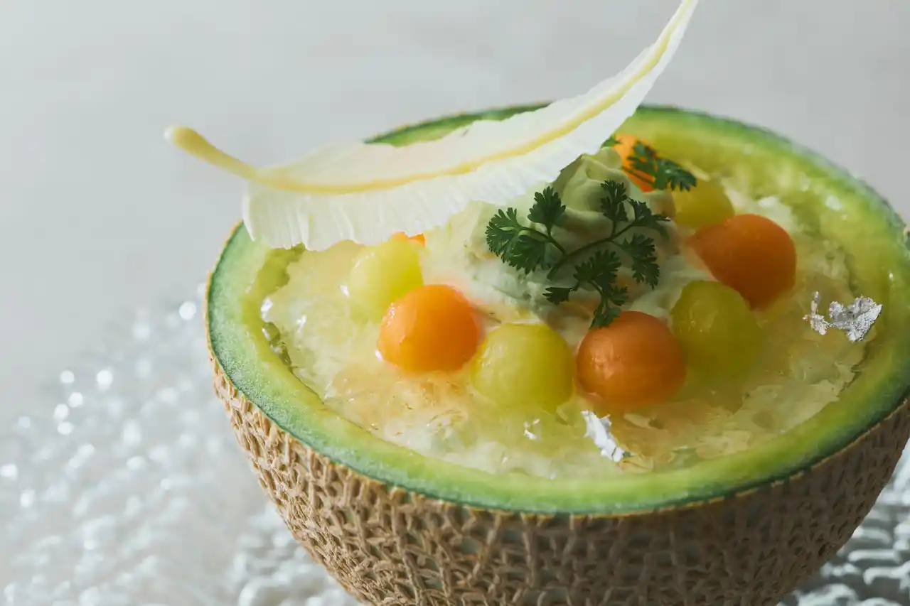 メロンを器に仕立てた、初夏の光をまとう季節のパルフェです。瑞々しい2種のメロン果肉を主役に、清涼なサイダーのジュレと柔らかな杏仁ミルクプリンが重なり合い、繊細なホワイトチョコの羽と銀箔が至高のひとときを華やかに彩ります。果実本来の甘みと香りをダイレクトに愉しむ一皿です。 |