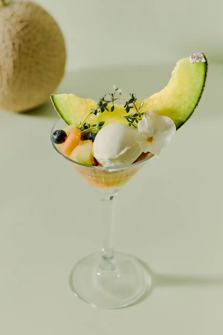 旬のフレッシュのメロンを主役に、幾重にも重なる美味しさをグラスに閉じ込めたシェフ渾身のパルフェです。 トップには瑞々しいメロンを大きくカットし、メロン香るミルク風味の豊かなアイスクリーム、エディブルフラワーを添えて夏らしく華やかに。最後の一口までお楽しみいただけるよう、底には爽やかなサイダーゼリーを敷き詰め、後味はすっきりと仕上げました。スプーンを進めるたびに変化する、香りと食感のマリアージュをご堪能ください。 |