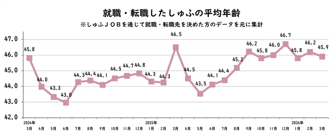 転職しゅふの平均年齢は45.9歳となり、前月比-0.3歳、前年同月比では-0.6歳となりました。 |