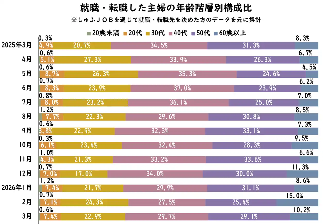 3月は例年、学校の長期休暇や新学期前の準備により、子育て層の求職活動が鈍化しやすい時期ですが、今年は40代の比率が上昇しており、子育て層の一部に動きが見られます。 |