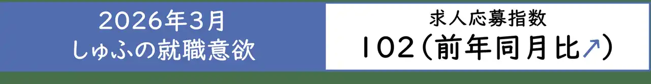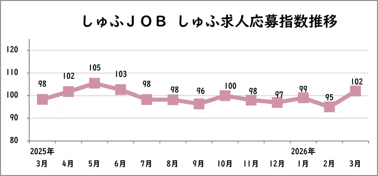 前月に比べ、求人数は減少、応募数は増加しました。3月は新年度に向けて、しゅふ層の就職活動が活発化するタイミングとなります。2026年も例年通りの動きとなり、応募数が増加しました。 |