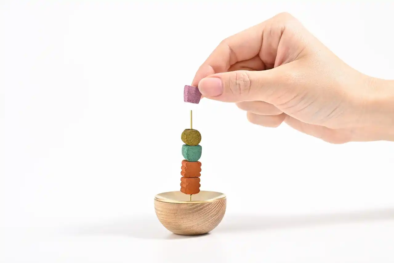 気分に合わせて、香りや色が異なるお香を最大5つまで積み上げることができます。天辺に火を灯せば、ブロックが燃え進むごとに香りが変化し、嗅覚を通じて「時の移ろい」をやさしく伝えます。 |