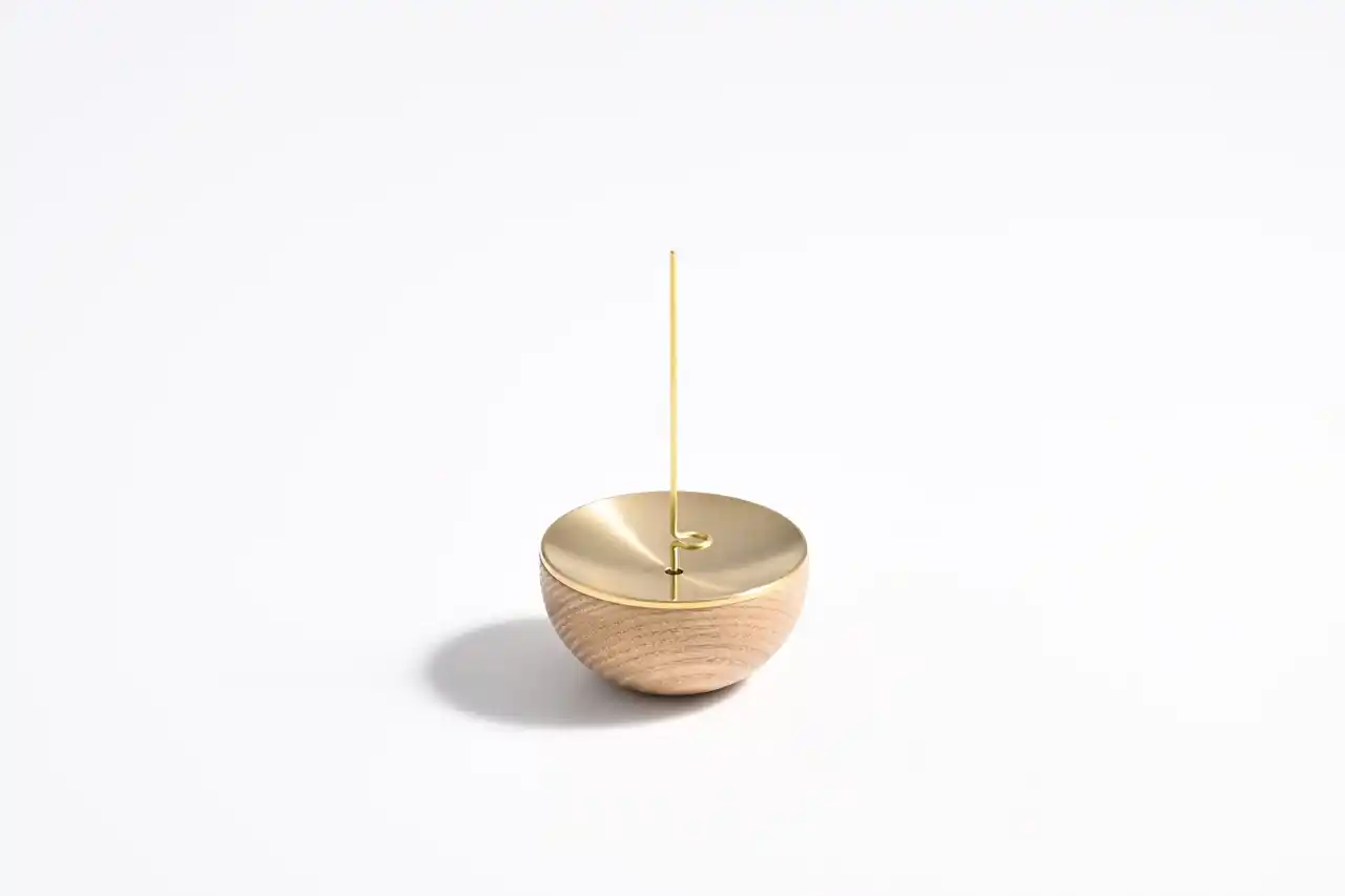 温かみのある木製のベースに真ちゅう製の受け皿を重ねることで、1つの調度品のような佇まいを目指しました。中央に向かって緩やかな傾斜を持つ金属パーツが、燃え落ちる灰を美しく受け止めます。異素材が調和するミニマルなデザインは、どのような空間にも静かに馴染みます。 |
