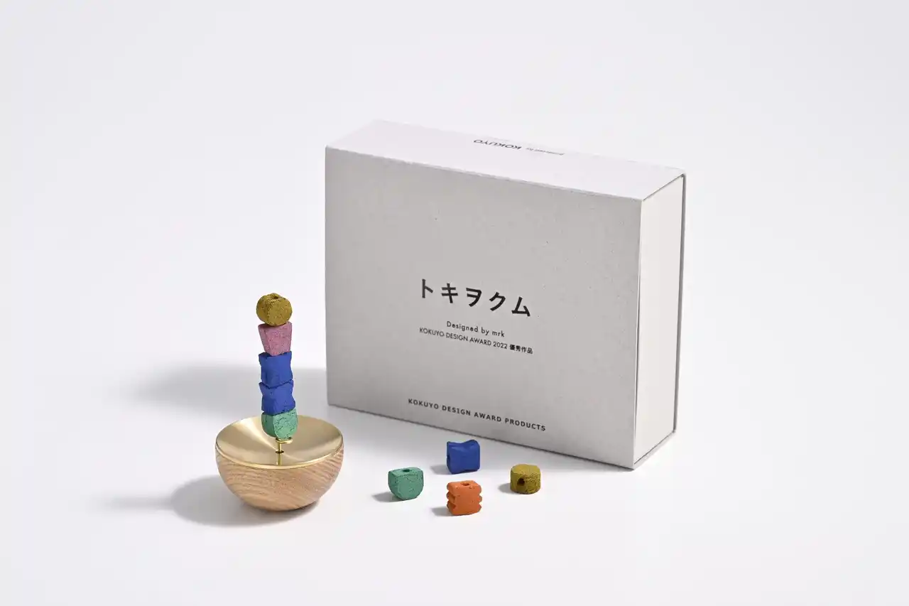 コクヨ株式会社(本社:大阪市/社長:黒田 英邦)は、コクヨデザインアワード2022優秀賞受賞作品「トキヲクム」を株式会社松栄堂(本社:京都市/代表:畑 元章)と共同開発し、4月下旬から50セット限定(※)で発売します。本作は、お香を積み上げて「これから過ごす時間」をデザインする商品です。製品化にあたり、京都伝統の薫香(くんこう)を手掛ける松栄堂が製造し、両社の直営店にて発売します。 |