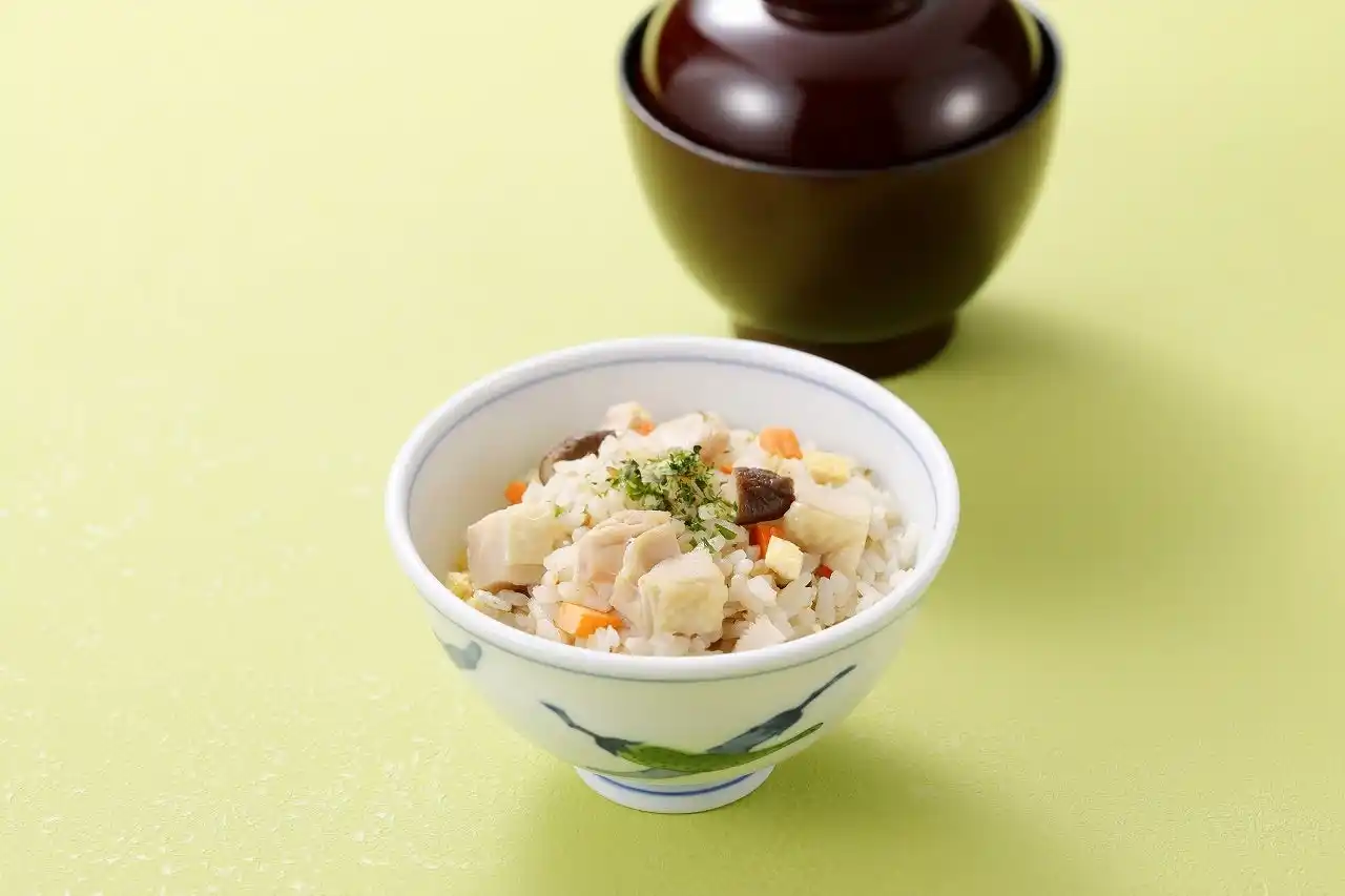 茶碗蒸し/鶏梅味噌掛け/蕗キャラ煮/白山堅豆腐の湯葉餡かけ/新じゃがチップ 海老天ぷら 海老フライ串 野菜天ぷら/香物 |