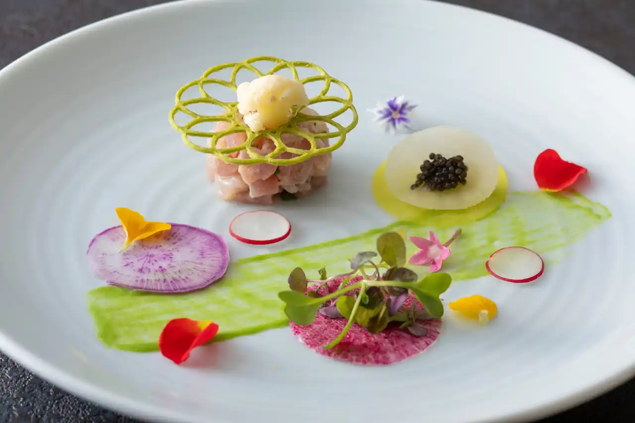 「懐石フランス料理 グルマン橘」では、ディナーコース「雅」にて、『キハダマグロと帆立貝のタルタル 彩り野菜と抹茶のチュイール キャビア飾り』がコース料理の最初を彩ります。キハダマグロとホタテをタルタルで軽やかに仕立て、抹茶のチュイールの香ばしさとキャビアの繊細な塩味が彩り野菜と調和し、一皿に上質な余韻を与えます。 |