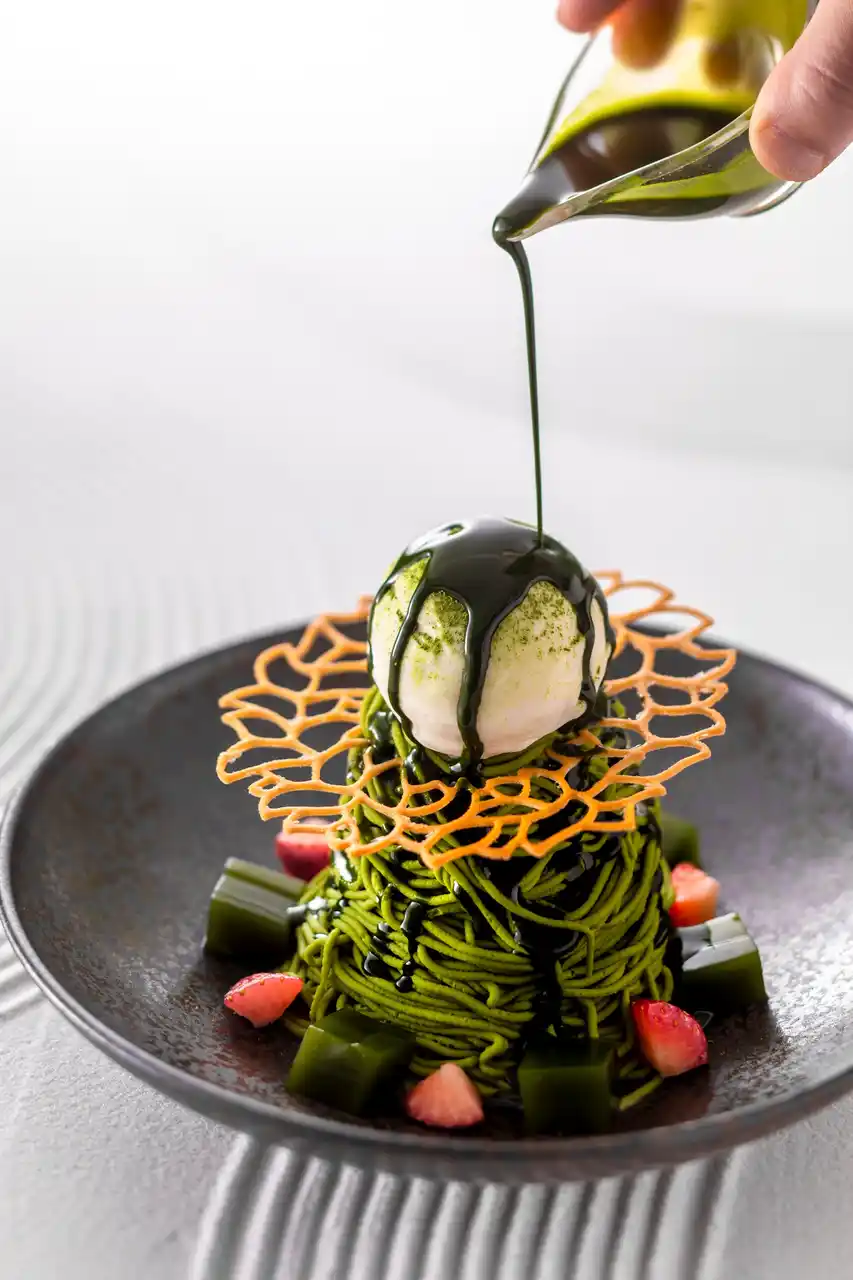 ラウンジで提供するのは、抹茶モンブランを主役にしたデザートです。濃厚な抹茶クリームは極細に絞り上げた、なめらかでコク深く、口に含んだ瞬間から抹茶本来の旨みが広がります。モンブランの頂に添えられた、やさしい甘さのアイスミルクが、抹茶のほろ苦さと美しいハーモニーを奏でます。 |