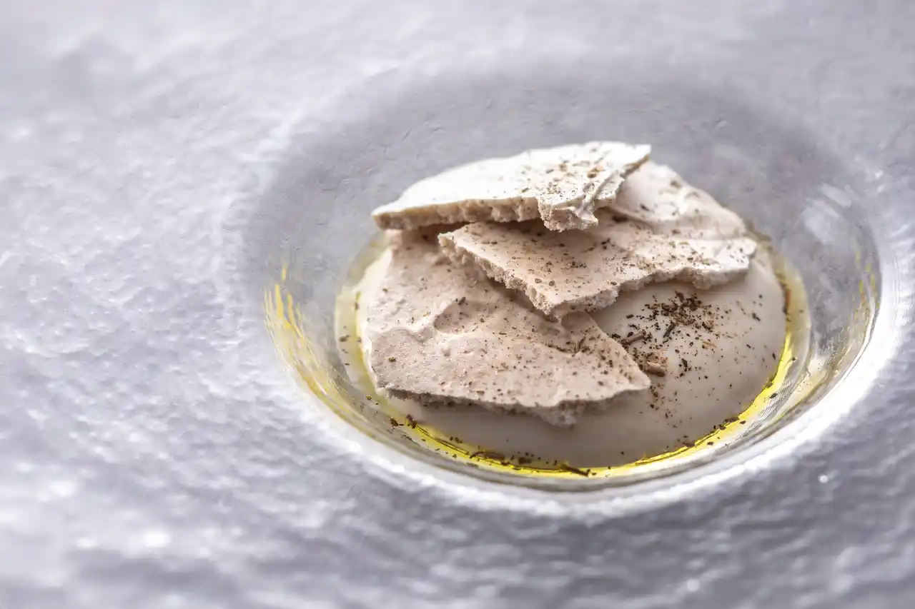 「フレンチダイニング トップ オブ キョウト」では、ディナーコースより「和束エトワール」が登場します。『和束町産ほうじ茶香る久在屋“京ふたり”のムース“由良オリーブを育てる会”より京都産エキストラバージンオイル』は、白くなめらかに仕上げたムースに、大豆のやさしいコクと自然な甘みを活かし、さらにほうじ茶の香ばしさを重ねました。口に運ぶと、ふんわりとしたムースの軽やかな舌触りが最初に広がり、続いてほうじ茶の深く穏やかな余韻が愉しめます。 |