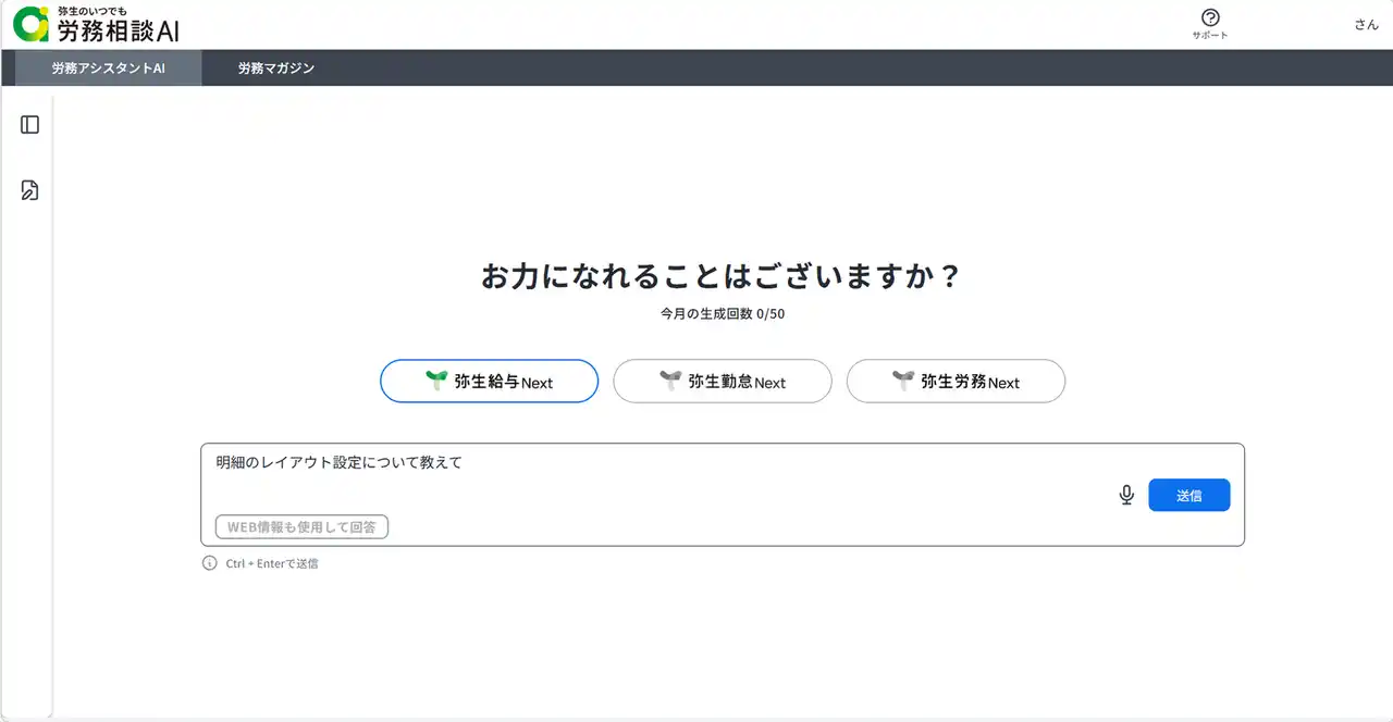 | 労務相談に加え、「弥生給与 Next」「弥生勤怠 Next」「弥生労務 Next」における操作・設定方法を法令・制度の観点から解説とセットで確認することが可能です 。弥生ユーザーの業務フローに即した形で、AIによるサポートを提供します。 | ||||||||