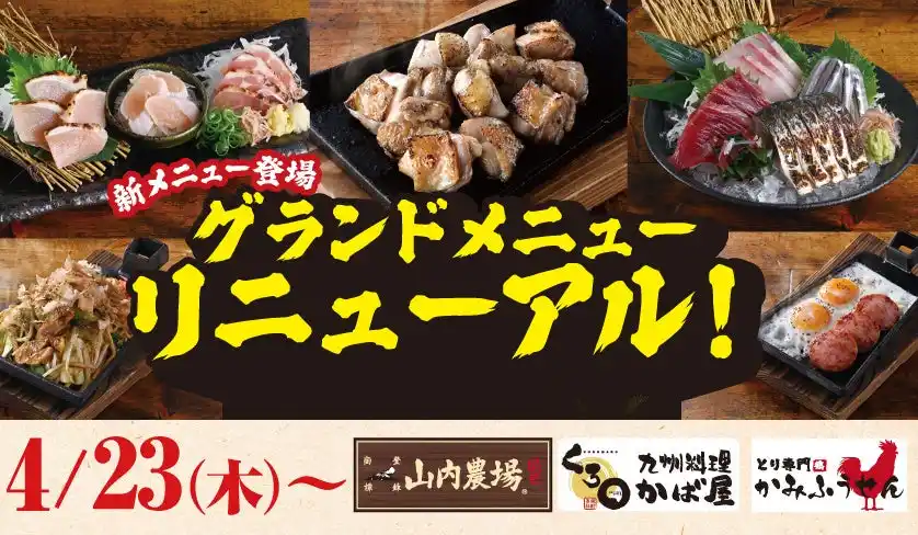 「白木屋」「魚民」「笑笑」「山内農場」などを全国に展開する株式会社モンテローザ(本社:東京都杉並区、代表取締役:大神輝博)は、2026年4月23日(※1)から、全国の「山内農場」「かば屋」「くろ○」「かみふうせん」のグランドメニューをリニューアルし、新メニューの販売(※2)を開始します。看板商品の“地どり”(※3)をつかった鶏料理やお刺身メニューなど、九州各地の美味しいお料理をお楽しみいただけます。 |