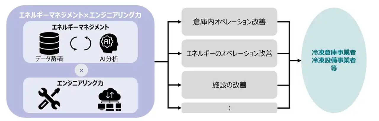 その中でも、物流量の拡大とともにエネルギー消費量が増加している一方で、より効果的な省エネルギー運用の可能性がありそうなコールドチェーン分野に着目しました。設備更新に頼るだけでなく、エネルギーマネジメント(データの可視化と運用改善)によって品質を維持しながらエネルギー効率を高められる方法があるのではないかと福山冷蔵株式会社と共に仮説を立て、その実証に着手しました。 |