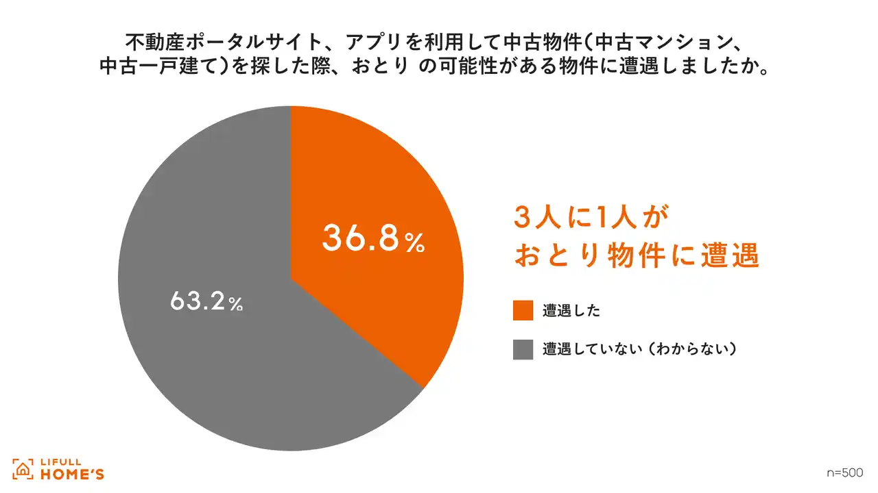 LIFULL HOME'Sが過去1年間に中古住宅購入を検討した500人を対象に実施した調査(https://lifull.com/news/46701/)では、中古住宅購入検討者の3人に1人がおとり物件に遭遇しており、購入検討者の住まい探しにおける大きな障壁となっている実態が明らかになりました。 |