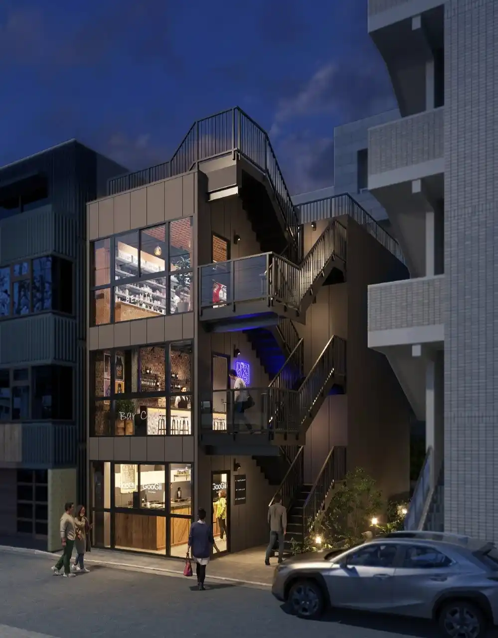 本プロジェクトは「より地域活性化に繋がる形で土地活用をしたい」というオーナー様のご意向を受け「フィル・パーク」を採用いただきました。「全面ガラス張り」を特徴とする外観は、夜間、建物から溢れる光が「街灯」のような役割を果たし、道を明るく照らします。これにより、通勤・通学路に面する立地の視認性を高めるとともに、地域の安全な住環境への貢献も期待できます。 設計面では、開放的な「廻り階段」を建物外周に配置することで、各フロアにおいてデッドスペースの少ない自由度の高い空間を各フロアで実現。こだわりのある店舗創りを求める多彩な業種のテナント様に対応できる空間となっています。また、廻り階段は、隣接するマンションのバルコニーと視線が干渉しないよう配置を工夫し、入居者の利便性と、周辺住民のプライバシーへの配慮を両立させた設計といたしました。 |