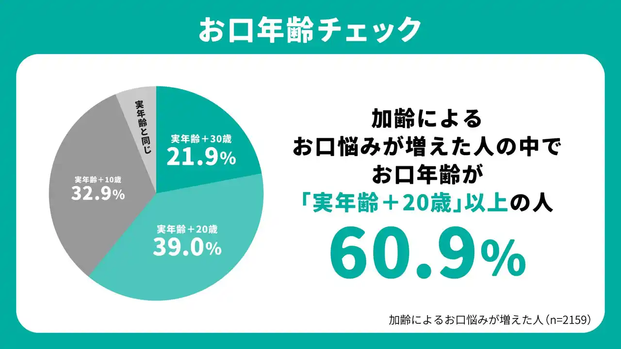実際に、加齢によるお口の悩みが増えている人は約6割に上ります。加齢によるお口悩みのある人の、約半数の人は、洗口液などのプラスアルファの対策が不十分であることが判明。その結果、お口年齢が「実年齢+20歳」以上(※2)の方は約6割を占めており、加齢によるお口環境の悪化が顕著に表れています。特に春先はストレス、生活リズムの乱れが重なることで、炎症老化が加速しやすい時期です。この時期のケア習慣が、その後のお口の健康状態に影響を与える可能性が考えられます。 |